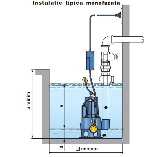 CARACTERISTICI TEHNICE DE CONSTRUCTIE ● CORP POMPA, CARCASA MOTOR: FONTA. ● TURBINA: mono canal, de FONTA. ● SUPORT: otel inoxidabil AISI 304. ● AX ARBORE MOTOR: otel inoxidabil EN 10088-3 - 1.4057. ● PRESETUPA DUBLA: carbura de siliciu - widia - NBR in partea pompei si inel protector in partea motorului (cu camera de ulei de blocare interpusa pentru lubrificarea si racirea suprafetelor de protectie in cazul lipsei de apa) ● MOTOR: sumersibil, asincron, 2 poli, cu serviciu continuu. MCm: monofazata 220÷240 V - 50 Hz cu dispozitiv de protectie termica a motorului incorporat in infasurarea statorului pana la 1.5 kW.