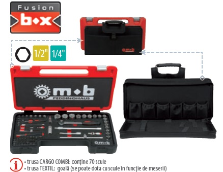Trusă scule manuale Fusion Box TEX trusa CARGO COMBI: conţine 70 scule, trusa TEXTIL: goală (se poate dota cu scule în funcţie de meserii)